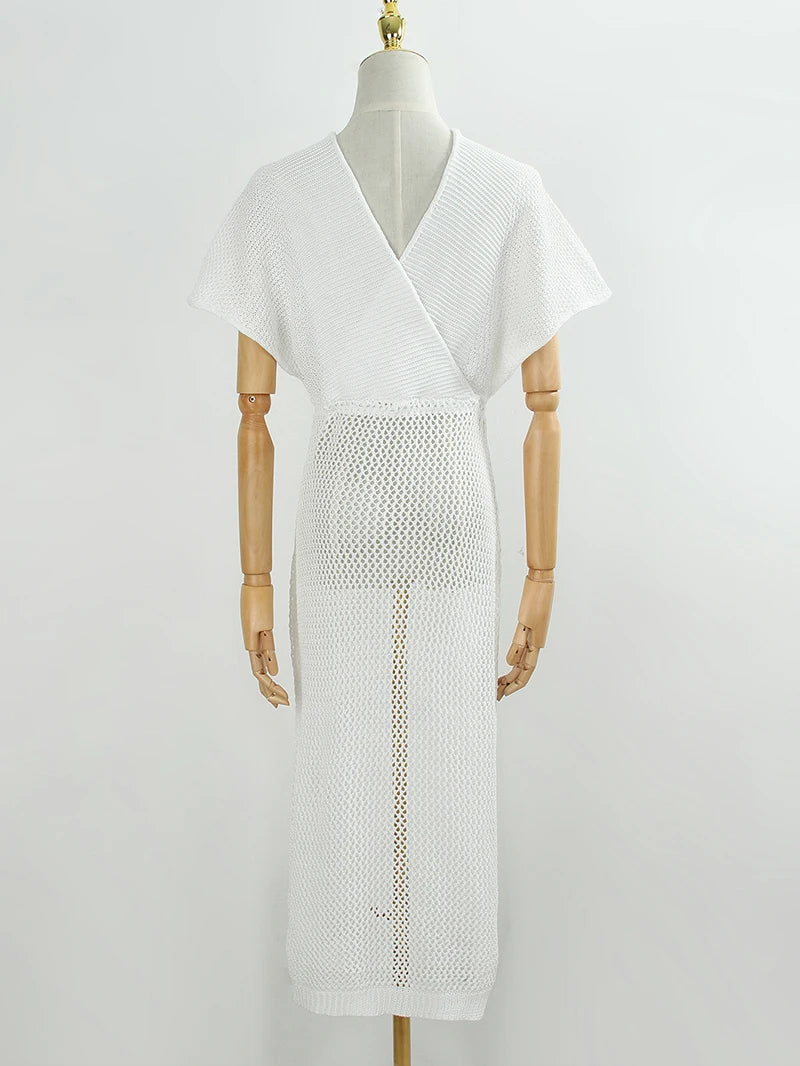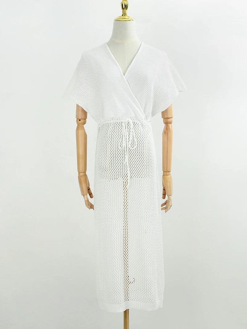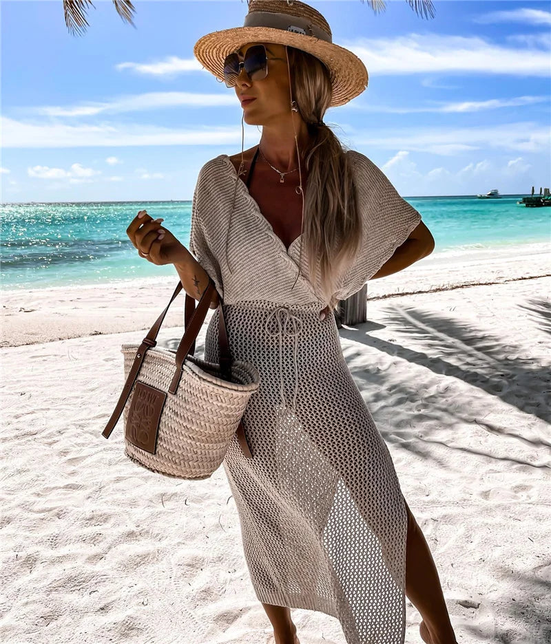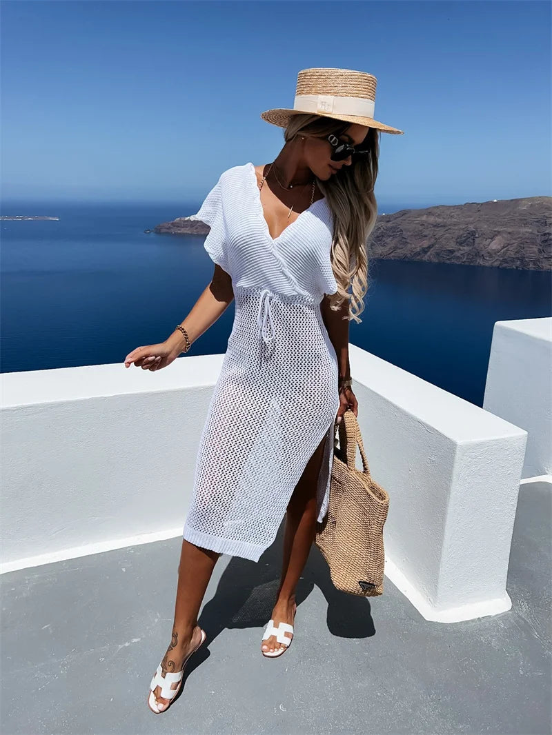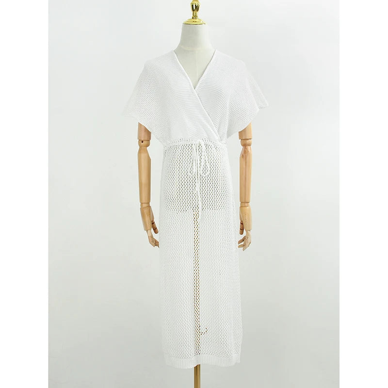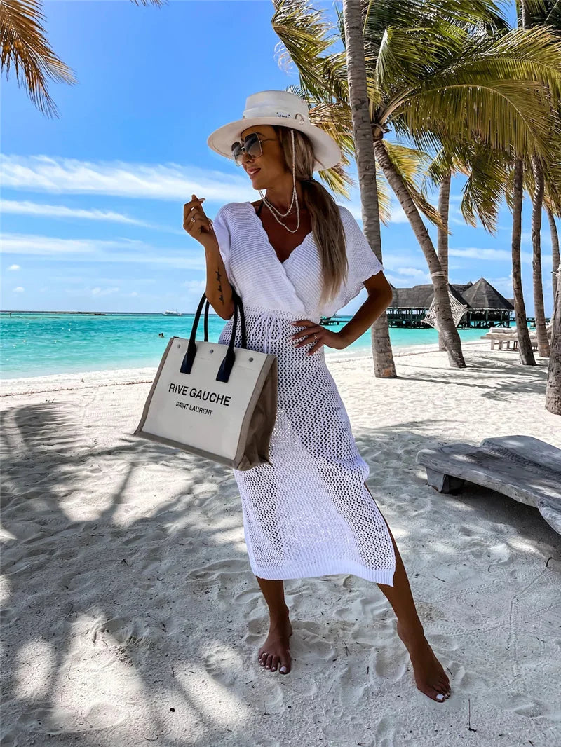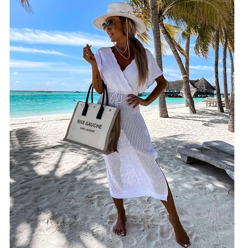 2024 White Crochet Tunic Bikini Cover-ups Sexy Hollow Out Long Dress V neck Women Summer Clothes Beach Wear Knitted Cover Up