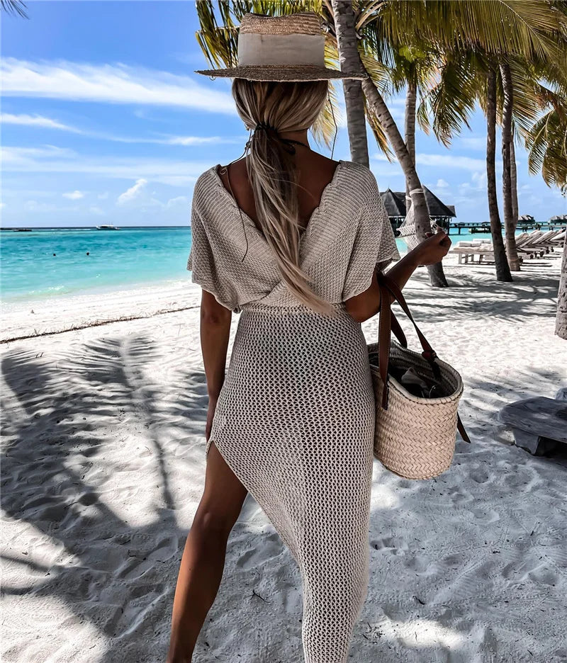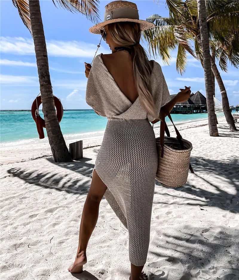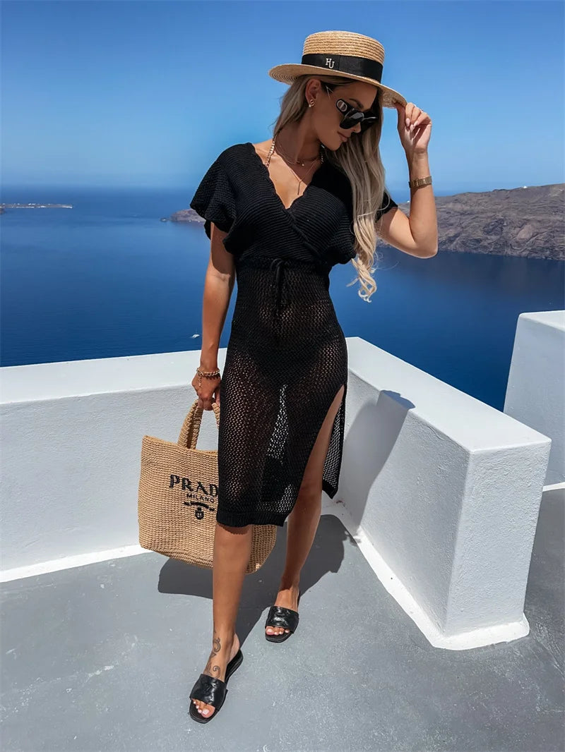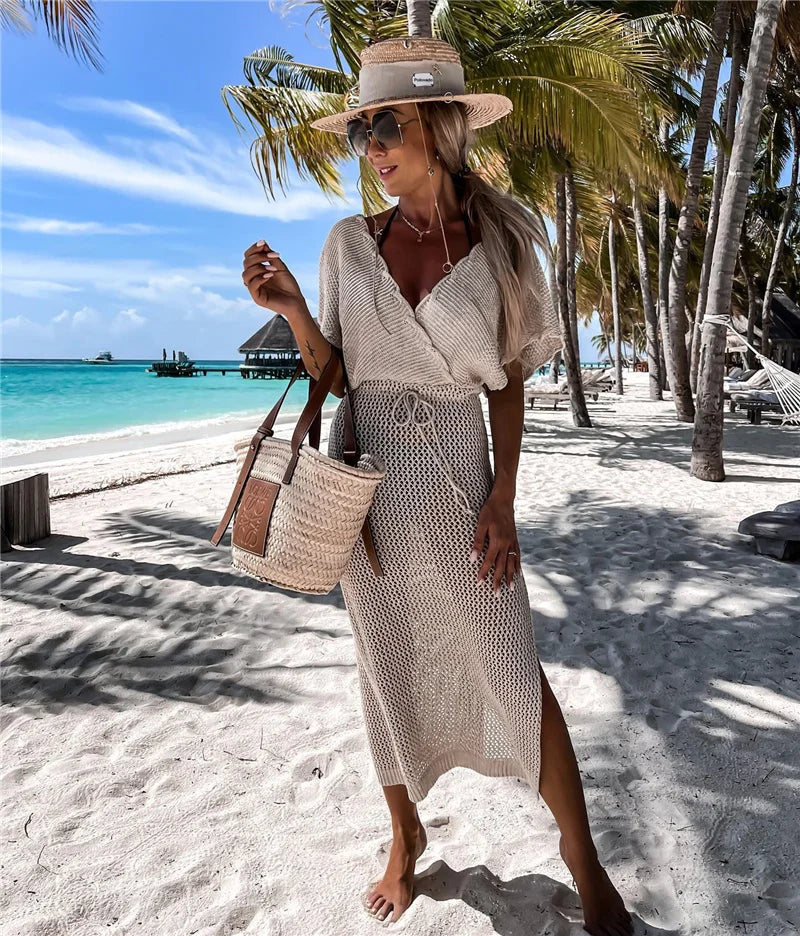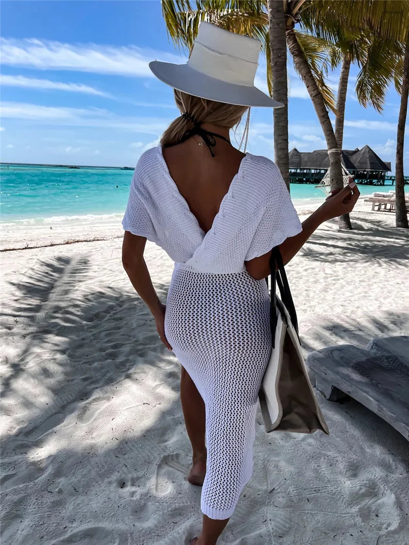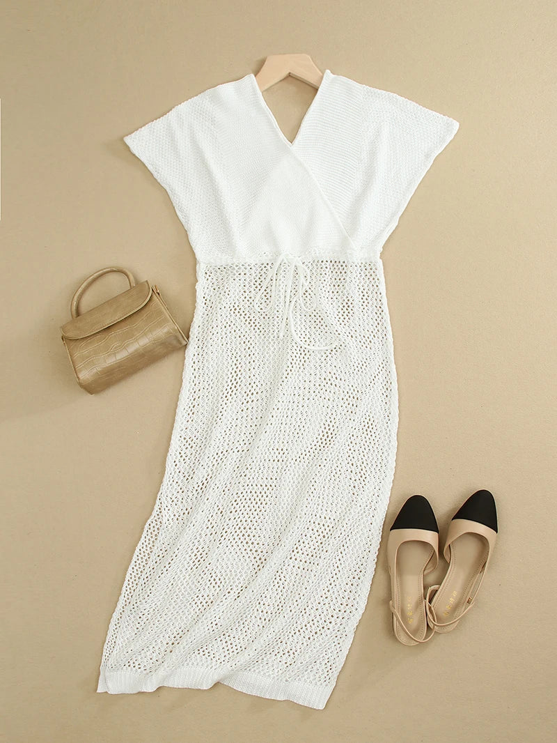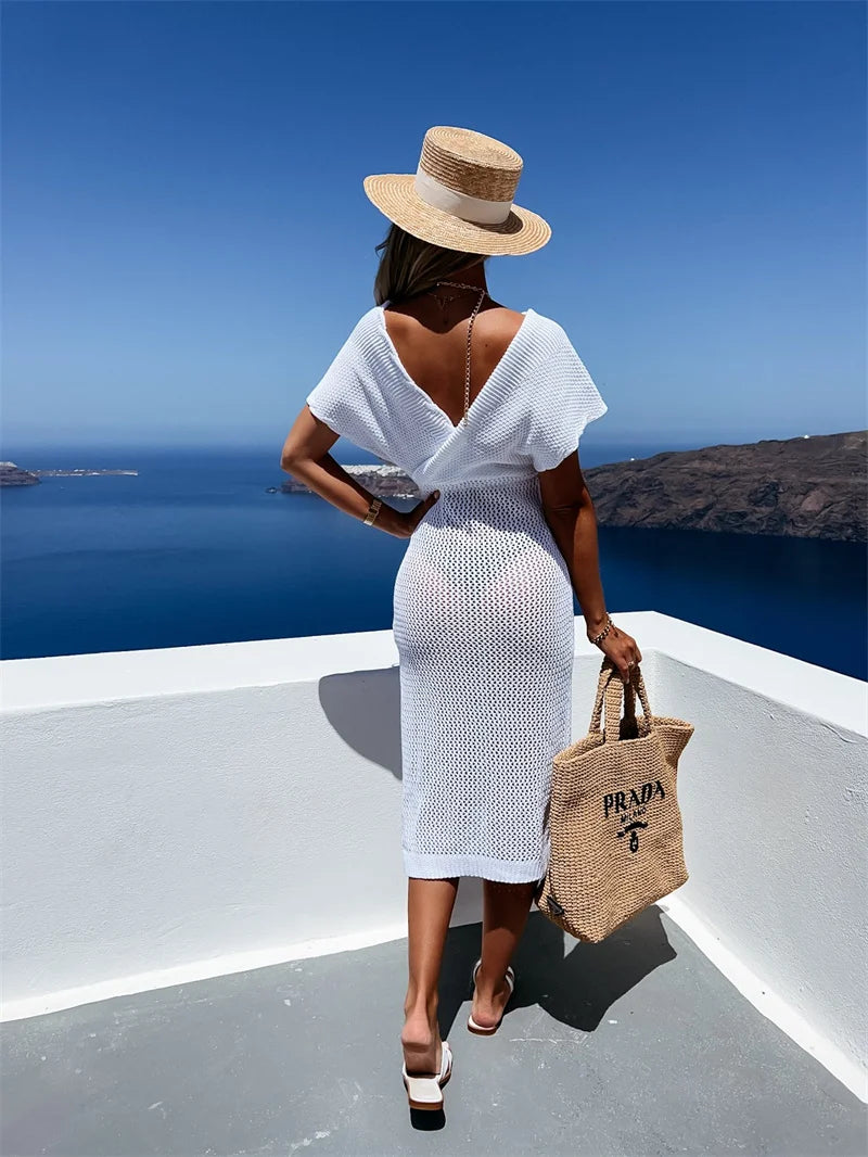 2024 White Crochet Tunic Bikini Cover-ups Sexy Hollow Out Long Dress V neck Women Summer Clothes Beach Wear Knitted Cover Up