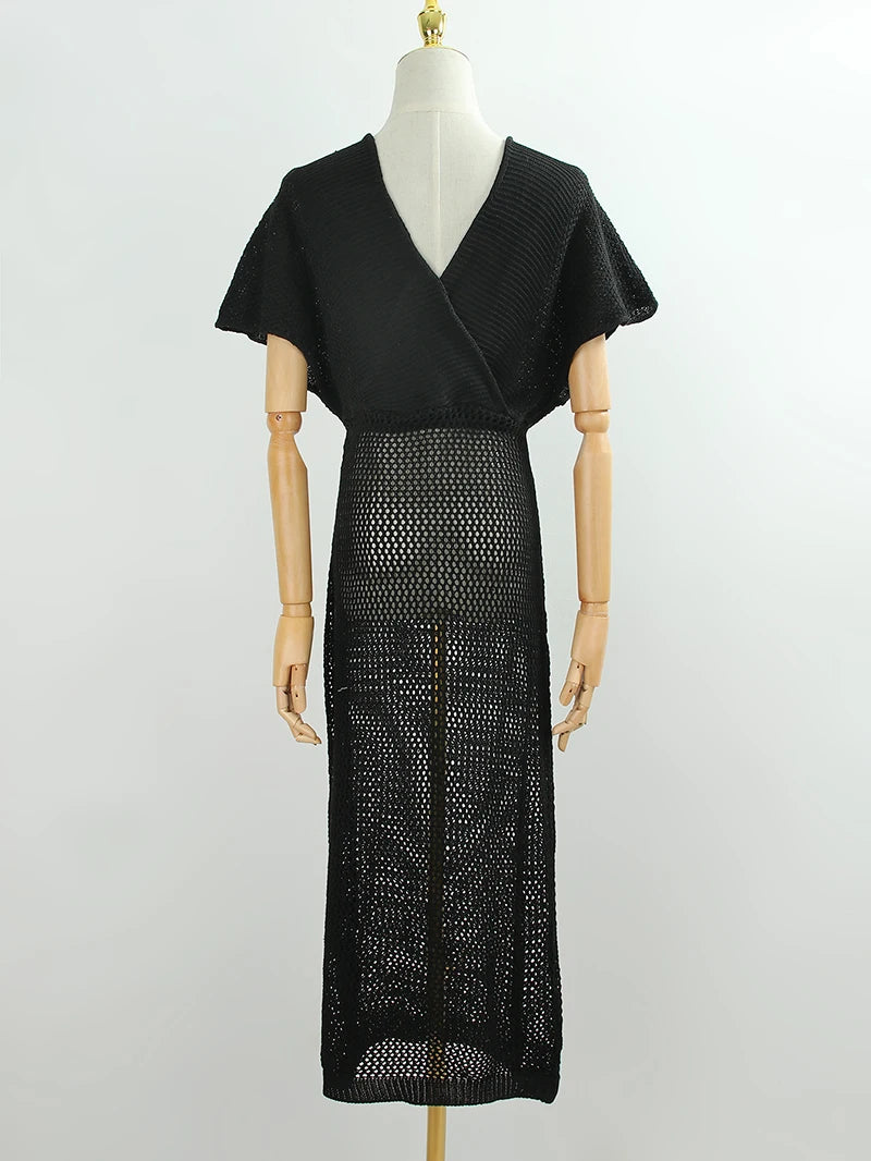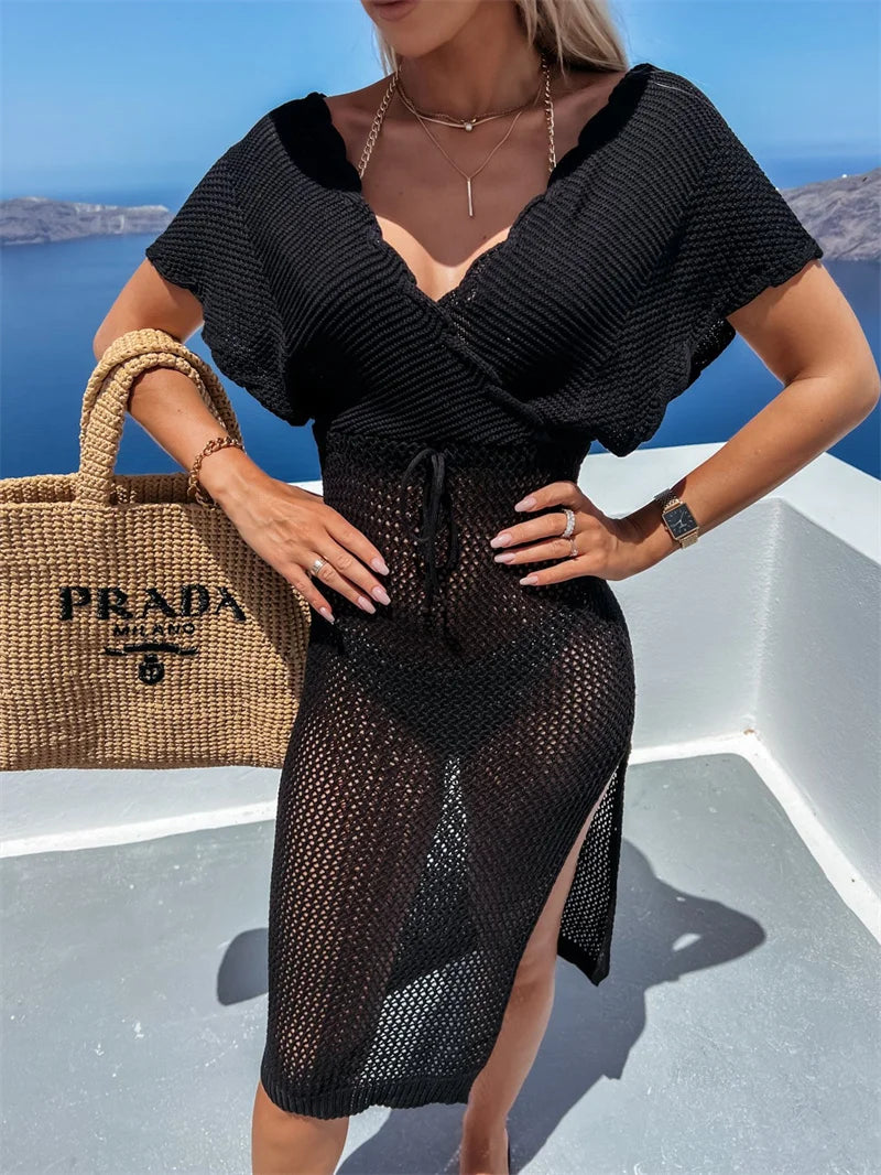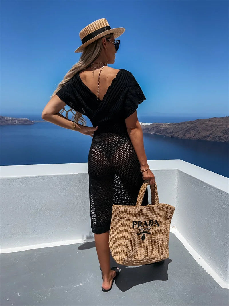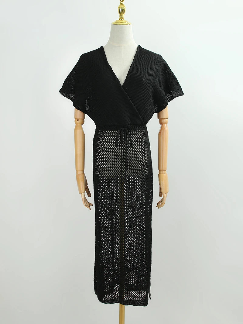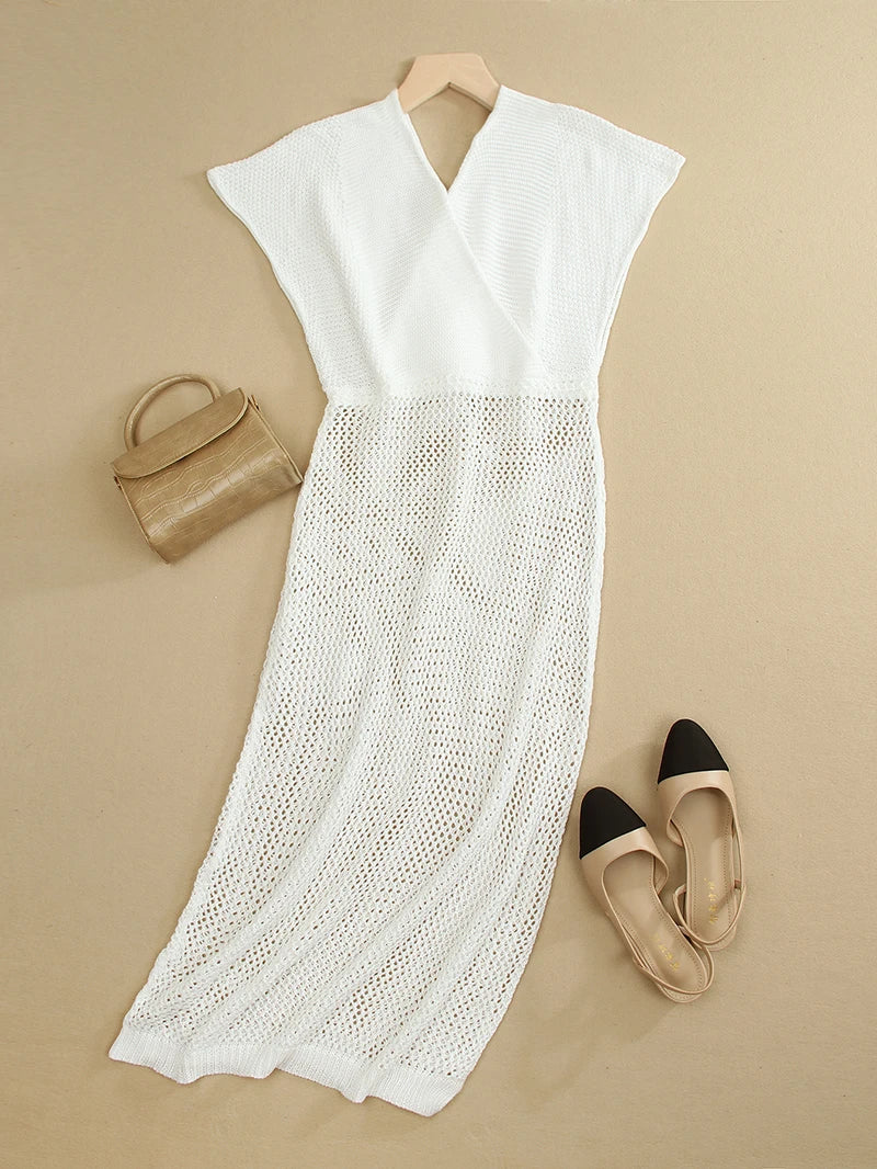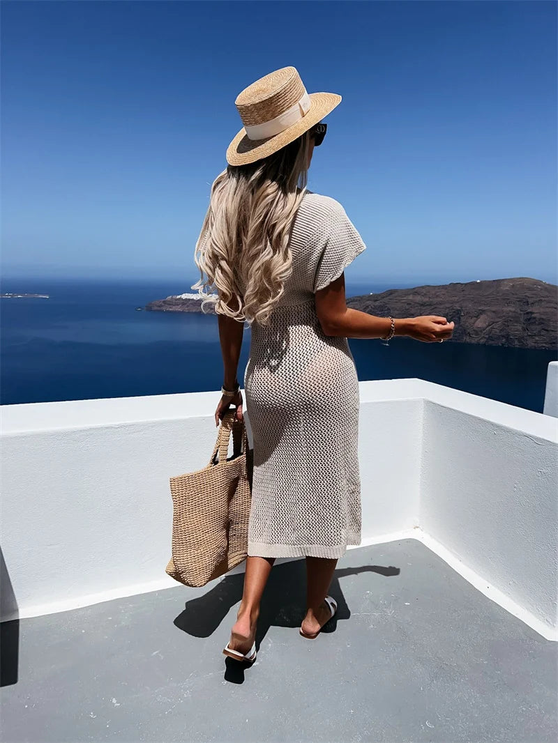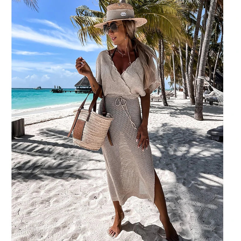 2024 White Crochet Tunic Bikini Cover-ups Sexy Hollow Out Long Dress V neck Women Summer Clothes Beach Wear Knitted Cover Up