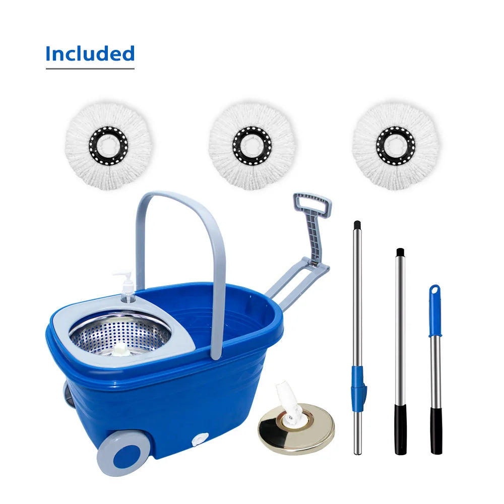 360° Spin Mop Bucket with Wringer Set Wheels Floor Cleaning Mop Blue 3 Mop Heads