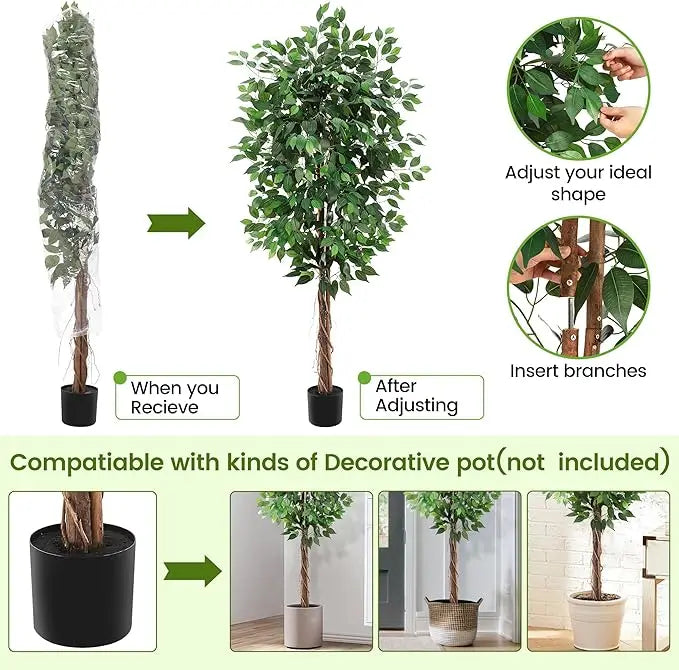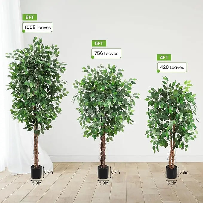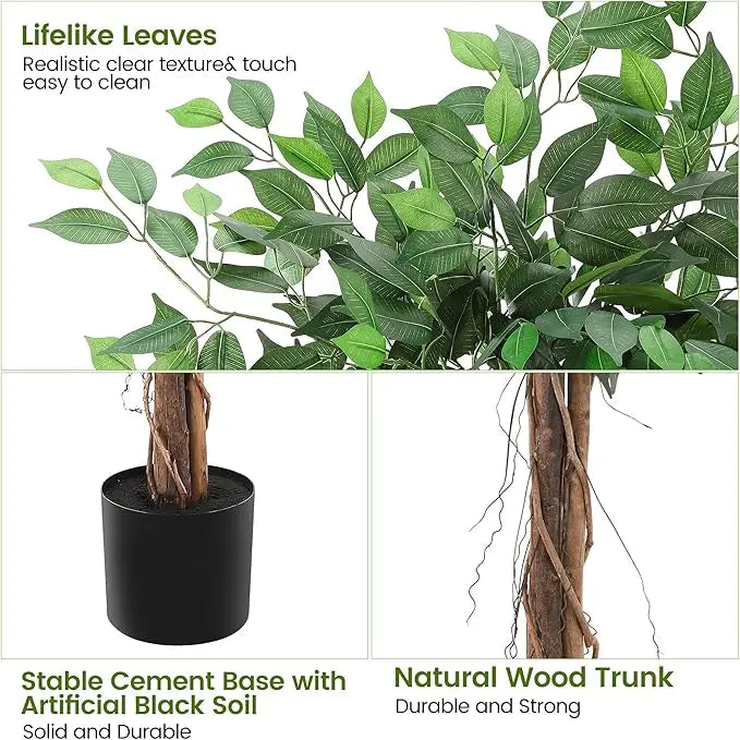 Artificial Ficus Tree Tall Fake Ficus Silk Tree with Natural Wood Trunk in Plastic Nursery Pot for Indoor Outdoor Office Decor