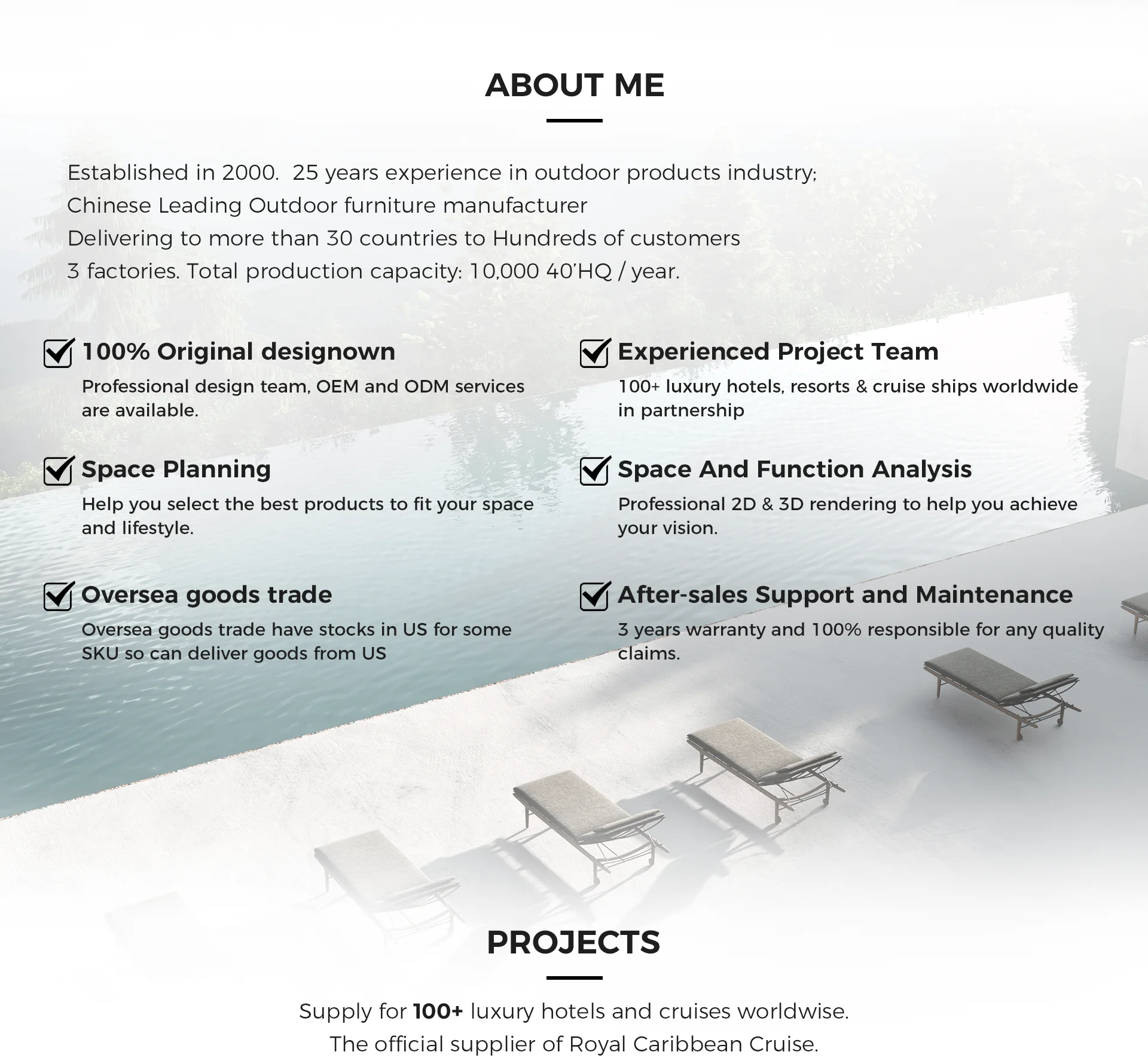 1.Multiple large in-house factories ensure large-scale supply capabilities and better cost; 2.With over 25 years of extensive export experience, we provide professional services; 3.A including Italian designers R&D team, better understanding of customers and products; 4.Equipped with an in-house laboratory and facilities, supported by a substantial quality control team, we ensure the stability and quality of our products; 5.The integration of traditional crafts (such as hand-woven rattan, hand-woven rope, and hand-painted) with fully automatic powder coating enhances the refinement and aesthetic appeal of our products;