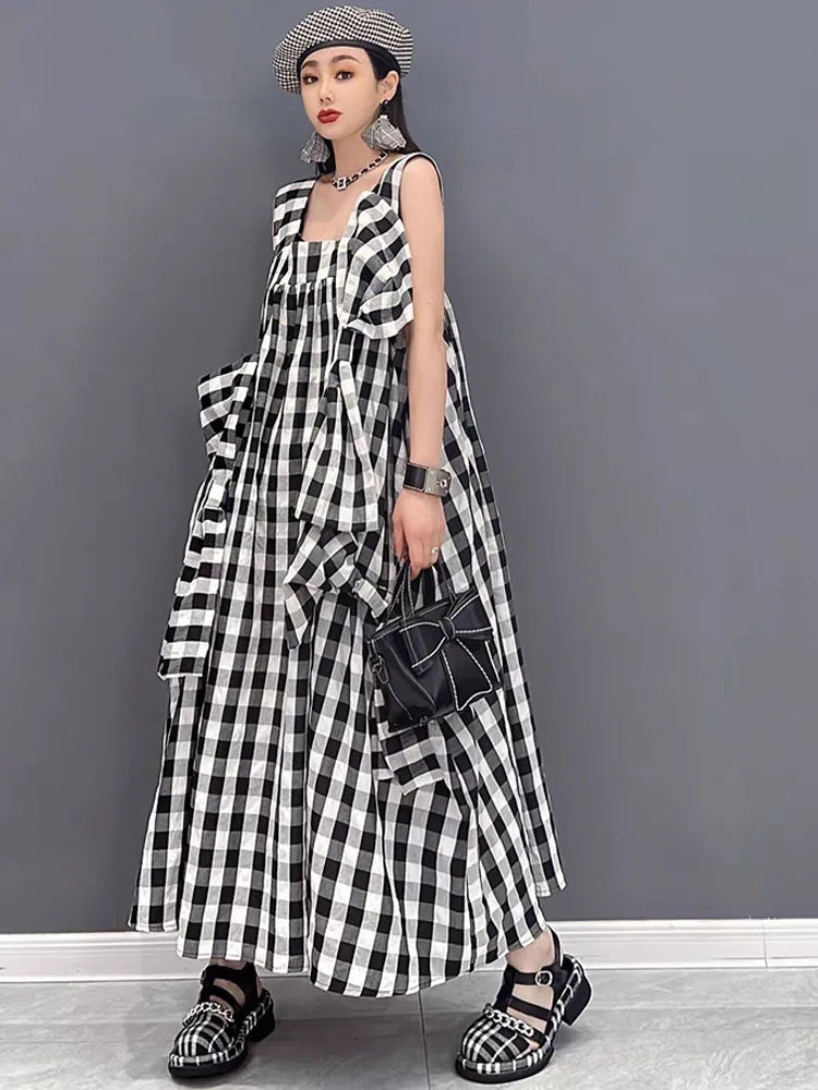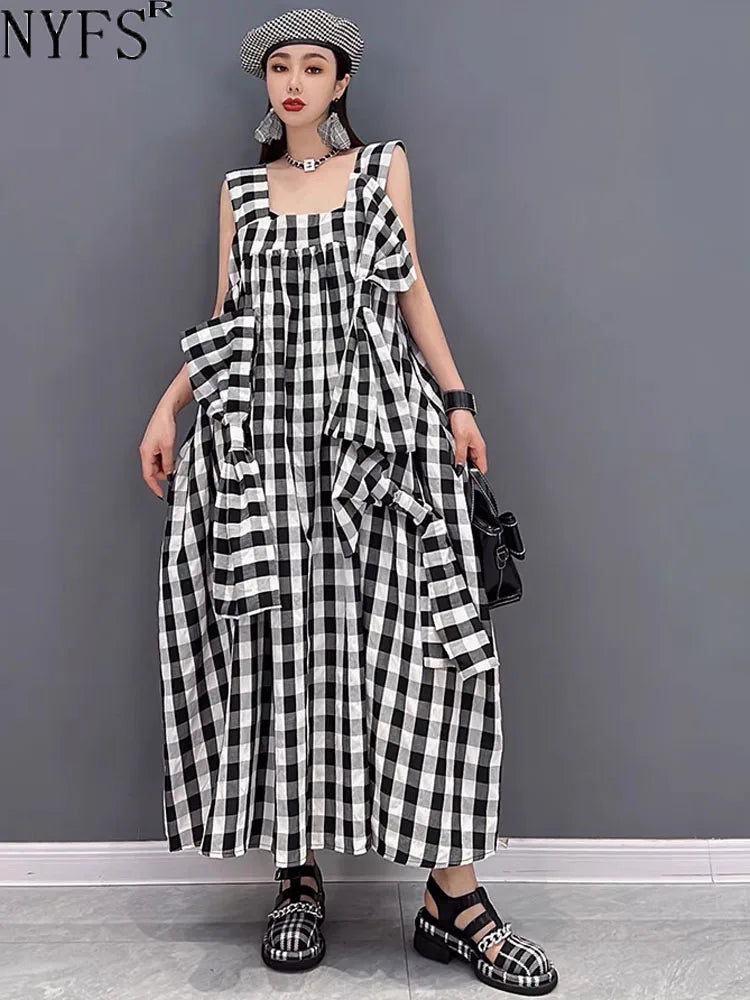NYFS 2025 Summer New Plaid Dresses Backless Sleeveless Patchwork Bow Small Fresh Minority Elegant Loose Plus Size Long Dress