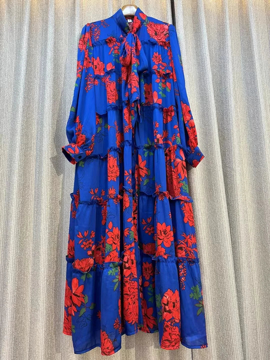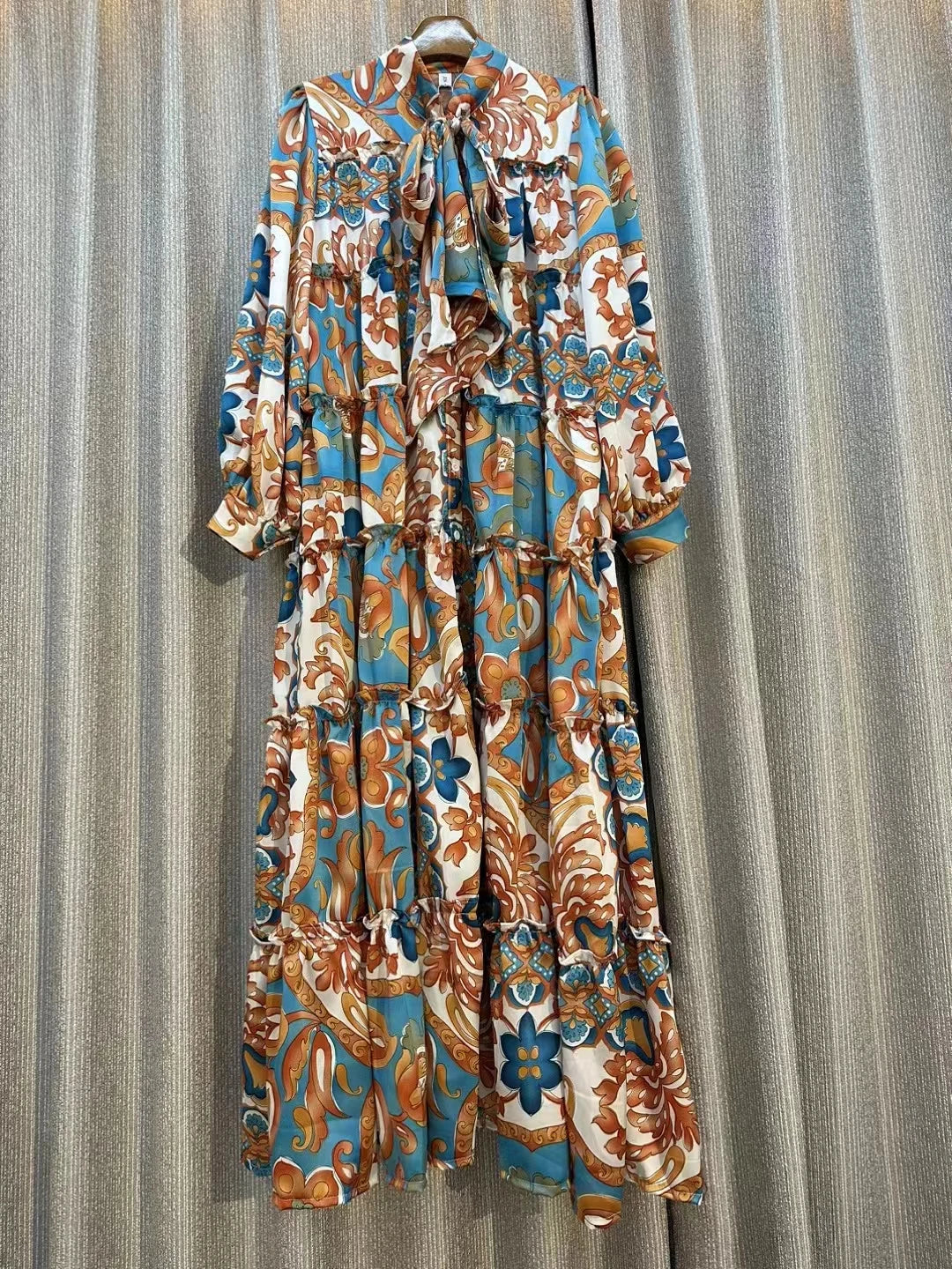 Print Pleated Single Breasted Retro For Women Bow Long Sleeve A-line Maxi Dresses Female Autumn Casual Vacation Party Long Dress