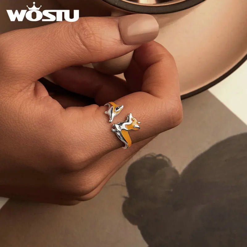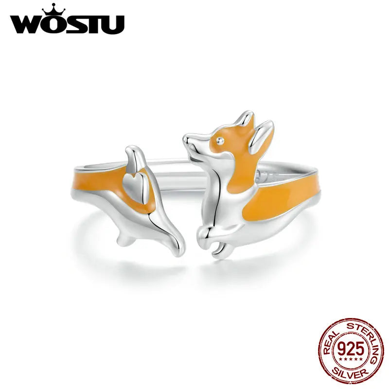 WOSTU 925 Sterling Silver Cute Yellow Corgi Dog Pet Opening Ring Girl Daily Wear Animal Adjustable Rings Gift For family Daugter